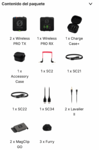 - Kit de accesorios completo, que incluye estuche de carga inteligente, dos Lavalier II micrófonos, cables, clips de montaje magnéticos MagClip GO y estuche de accesorios
